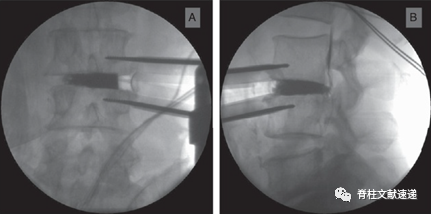 图1.通过透视的正位(A)和侧位(B)X线进行“造影剂充填技术”,以确保椎间椎间盘切除术的有效性,并检查术中终板有无损伤。