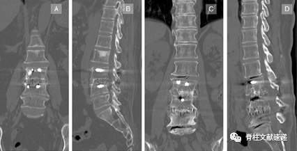 图2.术后薄层计算机断层扫描(CT)显示Cage无沉降融合(A,B)和Cage有沉降融合(C,D)。