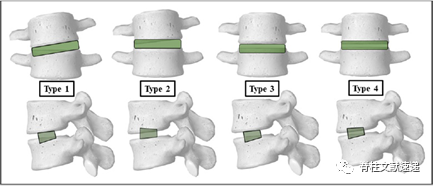 图3.Cage的沉降类型:类型1:对侧尾端终板下沉;类型2:对侧头侧终板下沉;类型3:双侧尾侧终板下沉;类型4:双侧尾侧和头侧终板下沉。(由于cage以右侧卧位从患者左侧插入,因此对侧终板下沉指的是患者右侧终板的下沉,而双侧终板下沉指的是左右终板的下沉。)