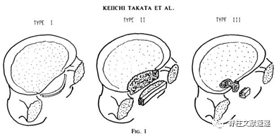 Takata分型:I、Ⅱ、Ⅲ型示意图三种类型骨折的图示。在I型中可见弧形碎片,但椎体后缘未见骨缺损。Ⅱ型是椎体后缘的撕脱骨折,碎片不是弧形的,CT横断位可以识别出骨质边缘尖锐撕脱。Ⅲ型是椎体后缘不规则后的局部离断。