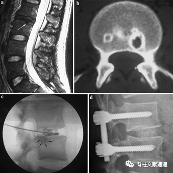 图注:a.26岁男性患者,腰痛4年,MRI检查示L2/3椎间盘退变和L3上终板存在终板损伤性病变(Schmorl 结节,白色箭头处);b.CT结果显示L3椎体上终板有圆形损伤病变;c.椎间盘造影显示造影剂流入L3上终板损伤性病变处(黑色箭头处),同时产生剧烈的疼痛刺激;d.患者行L2-3后路腰椎椎间融合椎弓根螺钉固定术,术后腰痛症状消失。