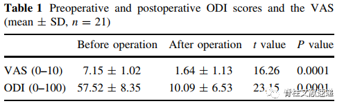 该文献作者为探寻严重终板损伤性病变引起腰痛的诊断和治疗,将21位患者纳入研究,对所有患者行X线、CT、及MRI检查,通过椎间盘造影确定患者疼痛程度及手术节段,通过疼痛视觉模拟评分(VAS)和ODI指数评估手术治疗的效果。