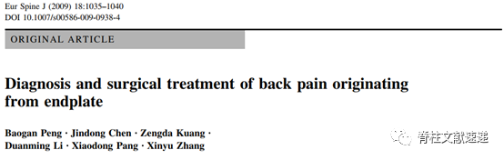 2、Peng B, Chen J, Kuang Z, Li D, Pang X, Zhang X. Diagnosis and surgical treatment of back pain originating from endplate. Eur Spine J. 2009;18(7):1035-1040.
