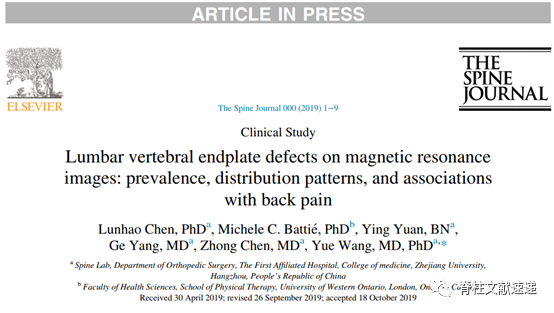 1、Chen L, Battié MC, Yuan Y, Yang G, Chen Z, Wang Y. Lumbar vertebral endplate defects on magnetic resonance images: prevalence, distribution patterns, and associations with back pain. Spine J. 2020;20(3):352-360.