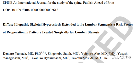 2.Yamada K, Satoh S, Abe Y, Yanagibashi Y, Hyakumachi T, Masuda T. Diffuse Idiopathic Skeletal Hyperostosis Extended to the Lumbar Segment Is a Risk Factor of Reoperation in Patients Treated Surgically for Lumbar Stenosis. Spine (Phila Pa 1976). 2018;43(20):1446-1453.