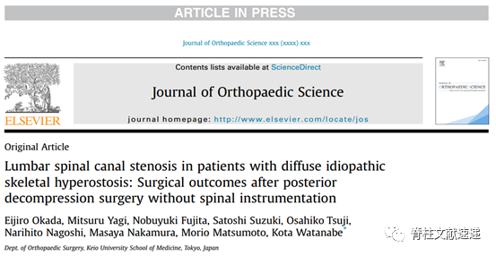 1.Okada E, Yagi M, Fujita N, et al. Lumbar spinal canal stenosis in patients with diffuse idiopathic skeletal hyperostosis: Surgical outcomes after posterior decompression surgery without spinal instrumentation. J Orthop Sci. 2019;24(6):999-1004.