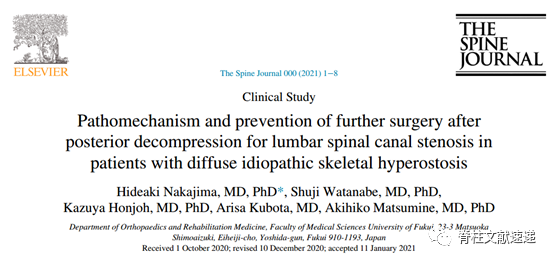 3.Nakajima H, Watanabe S, Honjoh K, Kubota A, Matsumine A. Pathomechanism and prevention of further surgery after posterior decompression for lumbar spinal canal stenosis in patients with diffuse idiopathic skeletal hyperostosis. Spine J. 2021;21(6):955-962.