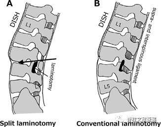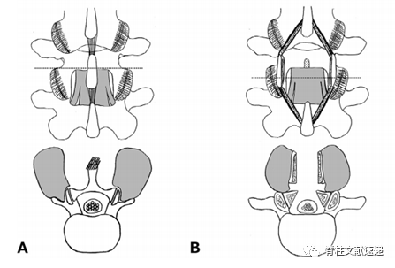 图注:此图为两种不同的后路减压的手术方式,图A为传统椎板切开减压术,术后保留了棘突、棘上韧带和棘间韧带。图B为劈开棘突的椎板切开减压术,该术式使棘突和棘间韧带在中间纵向分开,双侧椎旁肌在分裂的棘突的侧面。