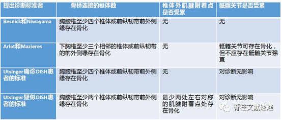 Arlet等,于1985年提出的诊断标准将所需椎体数量减少到3个,即:下胸椎至少三个相邻的椎体或前纵韧带的前外侧缘存在骨化;椎间隙高度正常;可伴有骶髂关节周围韧带及髂腰韧带处的骨化,但不存在骶髂关节强直;