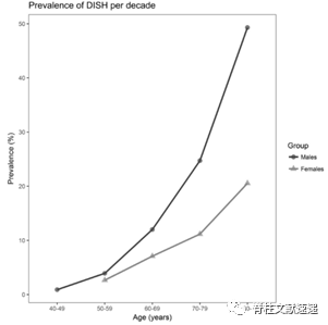 大量文献表明,性别与DISH患病率增加显著相关。男女比例高达7:1;并且随着年龄的增长,男女之间DISH患病率差异也呈现增长的趋势(如下图所示)。