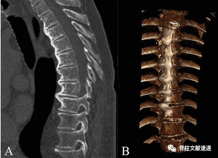 图注:一名70岁男性DISH病患者的CT检查结果,图A为矢状面重建中清楚的显示了超过4个胸椎间新生骨桥的形成。图B为其三维重建的结果。