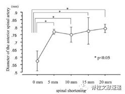 结果:硬脊膜囊和脊髓缩短从7.2 ± 1.7到12.5 ± 1.1 mm,硬脊膜囊变形,脊髓保持原有形态。缩短大于12.5 ± 1.1 mm脊髓弯曲并被弯曲的硬脑膜凹侧压迫。脊髓缩短5 mm和10 mm时,脊髓诱发电位未见变化,短缩15 mm脊髓诱发电位变化。在缩短5、10、15和20 mm时,脊髓血流量分别为146 ± 10%、160 ± 21%、102 ± 17%和93 ± 7% 。