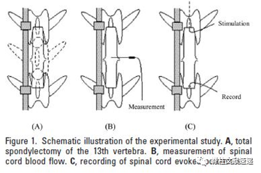 图注:研究示意图A、 第T13椎体全脊椎切除术。B、 脊髓血流量监测。C、记录脊髓诱发电位。