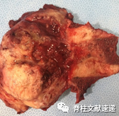 图注:被整体切除下来的腰椎脊索瘤的大体观。可见其为具有明显软组织成分的膨胀性肿块。