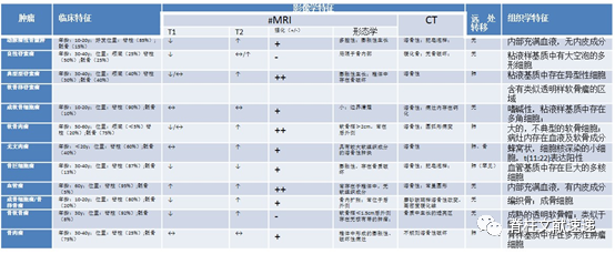 其影像学表现及与其他肿瘤的鉴别诊断见下表。