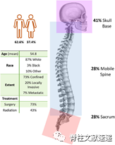 病变最长累及颅底(41.1%)其次为骶骨和脊柱。总体中位生存期为102个月,但颅底脊索瘤(中位生存期约为162个月)相较于骶骨(87个月)和脊柱(95个月)预后较好,但颅底 (65%)、骶骨 (60%)和脊柱 (68.4%)的总体五年生存率相似。