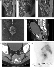 图注:累及S3-5的脊索瘤的影像学结果。可见病变累及骶骨并向骶前间隙侵犯。(A)矢状面和(B)冠状面MRI结果中T1加权像提示低信号改变,病变累及骶管。(C)矢状面和(D)冠状面T2压脂像提示累及骶神经根的高信号病变。(E)和(F)为增强CT结果显示病变累及骶骨。(G)为放射性示踪成像的结果