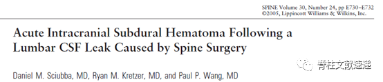 脊柱外科手术中,硬膜切开/撕裂是导致脑脊液漏最常见的并发症之一。在大多数情况下,症状不需干预即可自行缓解。然而,颅内低血压也与急性颅内硬膜下血肿(SDH)的发展有关,可能是由于颅内压快速下降后牵引静脉结构所致。目前文献报道仅有22例。虽然术后SDH的预后一般是良性的,但也有一些病例导致了严重的患者后果,包括死亡,下面我们通过文献一起来了解一下其发生原因及治疗。