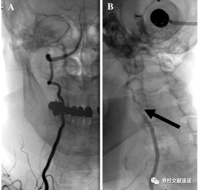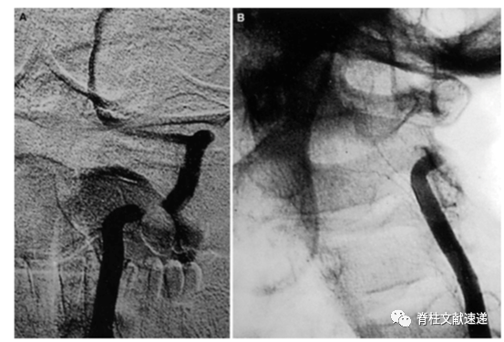 图注:上图为椎动脉DSA,图A为头在中立位时的C1/2处左侧的椎动脉,无异常;图B为头向右旋转40度时,V3段椎动脉完全闭塞了。