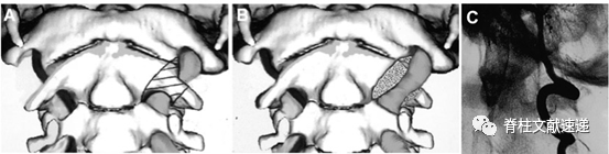 图注:如上图所示:颈前入路,下颌下横切口。显露颈2、3椎体,切除症状侧部分颈长肌,从腹侧切开症状侧C2椎动脉孔,游离椎动脉V3下段,微型彩超术中观察转头后椎动脉无闭塞。术后DSA(图C)确认解除动态性椎动脉闭塞。