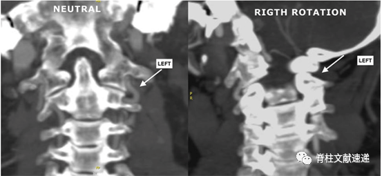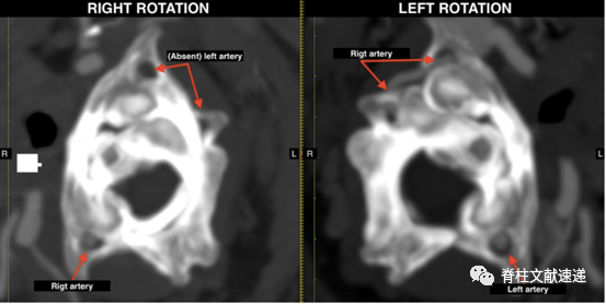 图注:CTA轴位:左图为头部右转时,右侧椎动脉可见,左侧V3段椎动脉闭塞。右图为头部左转时,双侧椎动脉可见。该患者行C1/2固定融合术,症状缓解。