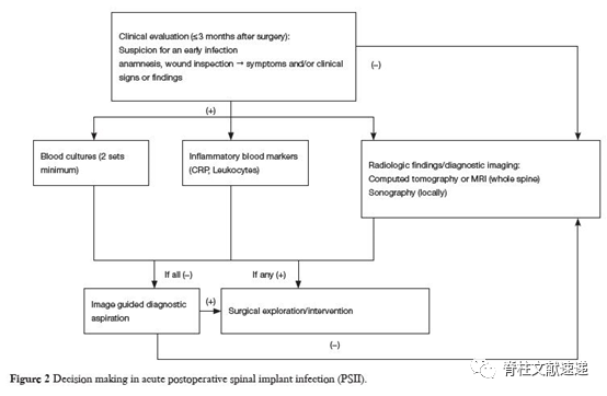 脊柱术后早期或急性感染是一种潜在的严重并发症,通常需要延长治疗时间,并与患者的不良预后密切相关。在关节置换领域,已经制定了诊断和治疗此类并发症的指南和建议,但在脊柱手术中,没有区分早期和晚期感染的明确定义,也没有具体的管理措施。早期感染的诊断有时可能很难确认,因为并非所有病例都涉及疼痛或实验室炎症参数升高。此外,内固定植入物及其引起的伪影也很难区分血肿、水肿和术后感染。