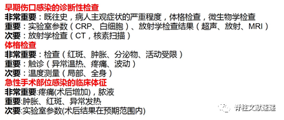 3. 脊柱术后早期感染的诊断需要结合患者症状、体征、细菌学、检验学及影像学等综合手段;