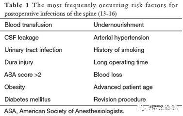 2. 术后早期感染的危险因素:输血、脑脊液漏、尿路感染、硬膜损伤、美国麻醉师学会(ASA)评分>2、肥胖、糖尿病和翻修手术;