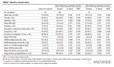 我们知道想要评估因果治疗效果,首选随机对照实验(RCT),但以往对LSS的研究表明,招募患者进行随机对照试验存在很大困难,然而观察性研究相对于RCT最大的问题在于数据偏差和混杂变量,针对于本研究,不能保证试验中选择手术治疗还是非手术治疗是该实验的唯一变量,这也就导致结果会出现偏差。该文献作者为了避免这一点使用了倾向评分匹配的方法来进行该次研究。