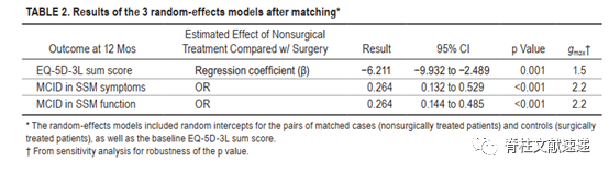 最后得出结果(如图2所示):手术组和非手术组经过一年的随访,手术组患者较非手术组患者EQ-5D-3L评分差异为-6.211分(95%CI -9.932至-2.489),手术组较非手术组腰椎管狭窄的症状及功能改善达到MCID的机会提高了3.8倍。
