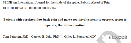 2. Petersen T, Juhl CB, Fournier GL. Patients With Persistent Low Back Pain and Nerve Root Involvement: To Operate, or Not to Operate, That Is the Question. Spine (Phila Pa 1976). 2020;45(7):483-490. doi:10.1097/BRS.0000000000003304.PMID: 31658235.https://www.ncbi.nlm.nih.gov/pubmed/31658235.