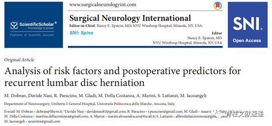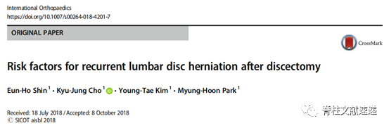 该文献为确定rLDH发生的危险因素,回顾性分析了209例行椎间盘切除术治疗的LDH患者的1年复发率,最终发现较高的体重指数(BMI)和手术后ODI评分与发生rLDH风险增加显著相关,并且年龄是复发的预测指标,但与文献一结论不同的是,该文献认为较大的患者年龄会增加rLDH发生的风险。