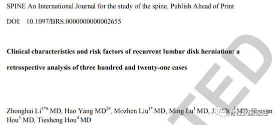 该文献回顾性分析了40例复发性椎间盘突出症患者和120例无复发的患者,以评估可能导致椎间盘突出症复发的危险因素。结论表明性别(男性),身高较高,工作繁重和吸烟者均为rLDH发生的危险因素,该结论与文献一较为相似。因此作者建议医生应提醒患者限制重体力工作,尤其是身高较高的男性,应戒烟以防止rLDH的发生。