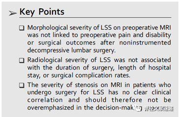 2、术前MRI上腰椎管狭窄症的形态学严重程度与术前疼痛、功能障碍或非内固定减压手术后的手术结果无关;