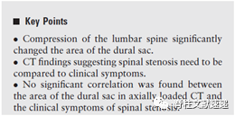 腰椎CT外部加压装置研究下,观察无轴向负荷和轴向负荷时腰椎硬膜囊面积的变化,并探讨其与腰椎管狭窄症临床症状的相关性。