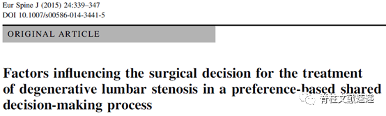 2、Kim H J , Park J Y , Kang K T , et al. Factors influencing the surgical decision for the treatment of degenerative lumbar stenosis in a preference-based shared decision-making process[J]. European Spine Journal, 2015, 24(2):339-347.