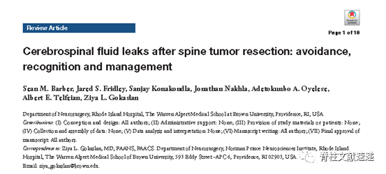 文献二:脊柱肿瘤切除术后脑脊液漏:预防,诊断和治疗