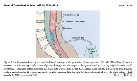 作者最后提出腰大池引流转移也可用作主要的预防和治疗脊柱手术后脑脊液漏的措施。在多数情况下,放置腰大池引流5-7天足以使硬脑撕裂愈合(报告的成功率:85-94%)。然而,硬脊膜大片缺损愈合所需的腰椎引流的天数尚未明确。