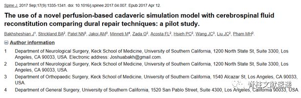 美国南加州大学凯克医学院神经外科Bakhsheshian J等在尸体上模拟进行了一项硬膜切开后再运用不同方法进行硬膜修复的实验,以评估各种修复方法预防脑脊液漏的效果。文章发表在2017年的spine杂志上。作者将新鲜的人尸体标本进行了硬膜内颈部脊髓置管,用于重建脑脊液系统。在6具尸体中通过椎板切除术从C7-T12暴露颈胸段硬膜,然后再打开整个硬脑膜,用6-0 聚丙烯缝线(n = 3)或4-0尼龙线(n = 3)缝合修复,并用生理盐水通过灌注系统加压至60mm Hg以检查是否存在泄露。在另外2具尸体中,制作六个单独的2厘米切口并用6-0 聚丙烯缝线或4-0 尼龙线,然后加压观察泄露情况。最后加入水凝胶密封剂,再次加压以检查是否有进一步的泄漏。结果显示6-0聚丙烯缝线预防脑脊液渗漏的效果优于4-0尼龙线(泄漏的平均压力阈值在6-0 聚丙烯缝线组中为66.7mm Hg,在4-0尼龙线中为43.3mmHg),而使用水凝胶密封剂均显著改善了两种缝合线的预防渗漏的效果。该实验支持我们在做硬膜缝合的时候选择更细的6-0聚丙烯缝线,并应用水凝胶密封剂。