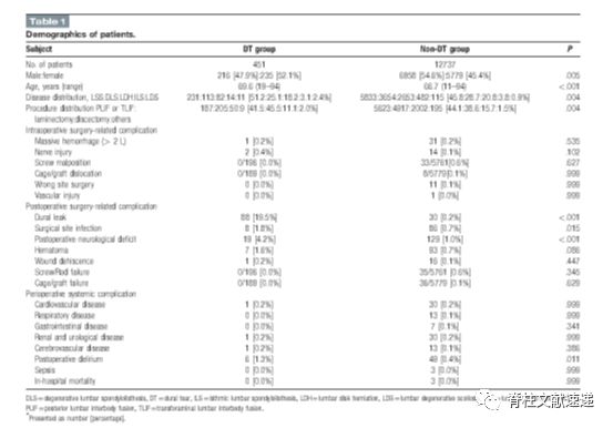 1.硬膜撕裂患者比未撕裂患者相比,更容易发生术后感染和神经功能损伤。至于其他围手术期全身并发症,术后谵妄的发生率在硬膜撕裂组中显著增高;