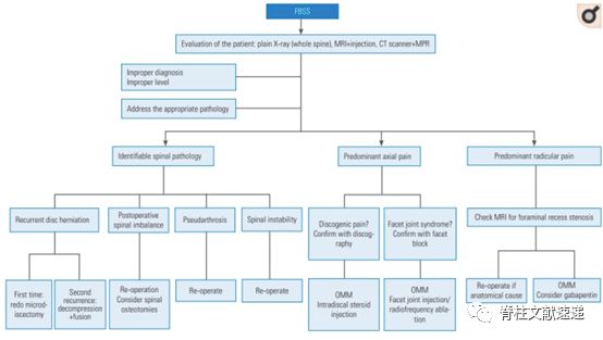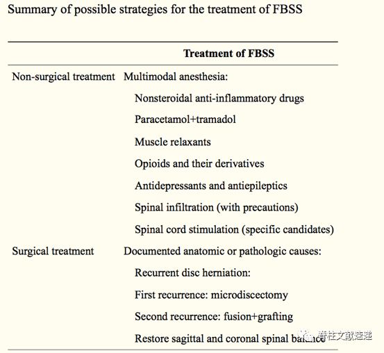 明确病因的FBSS患者可行手术治疗,手术绝对适应证是进行性加重的神经症状或马尾神经损伤,对于“完美”腰椎手术综合症患者,要慎重手术。
