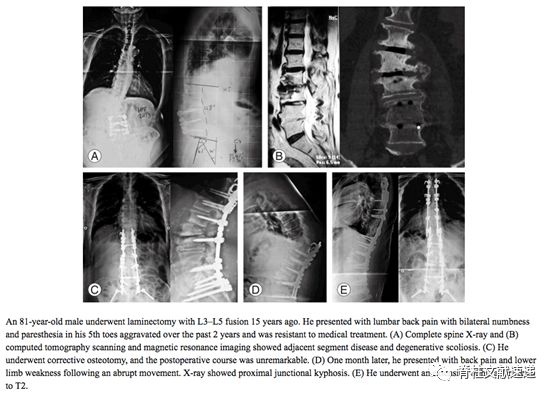 典型病例一:81岁男性患者,15年前接受L3-5椎板切除脊柱融合术,2年前出现腰痛和下肢麻木,诊断椎管狭窄伴脊柱侧弯,行手术治疗,1月后再次出现腰部疼痛和下肢无力,行翻修手术,固定至T2.(矢状面失平衡、PJK发生,主要原因是矫形曲度不合适,过度恢复腰椎前凸所致---笔者注)。