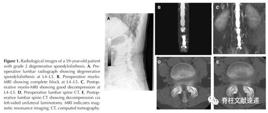 典型病例:图1显示一例59岁L4/5二度退行性滑脱患者:术前腰椎X线片(A)、术前和术后L4/5水平MRI扫描(B, C)、术前和术后CT断层扫描(D、E)。左侧椎板切除+双侧减压,术后随访5年,结果良好。