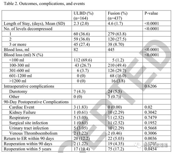 表2描述了两组手术特点对比:与融合相比组,ULBD显著缩短了平均住院时间(2.3天VS4.6天),平均失血(82 VS 445 ml), 5年随访的再手术率(10.4% VS 17.2%)融合。术后90天内,两组之间并发症及再手术率无明显差异。