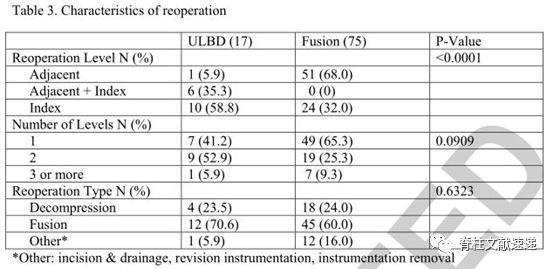 表3显示了两组再手术的特征:ULBD患者再次手术部位倾向于原手术节段 (70.6%,12/17),而接受融合手术的患者再次手术部位更多发于邻近节段水平(68%,51/75)。两组再手术方式无显著性差异。融合是最常见的再手术类型(ULBD 70.6%,融合60.0%)。