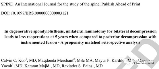 文献1:在治疗退行性腰椎滑脱中,与后路椎板减压植骨融合相比,单侧椎板切除+双侧减压5年后再手术率更低