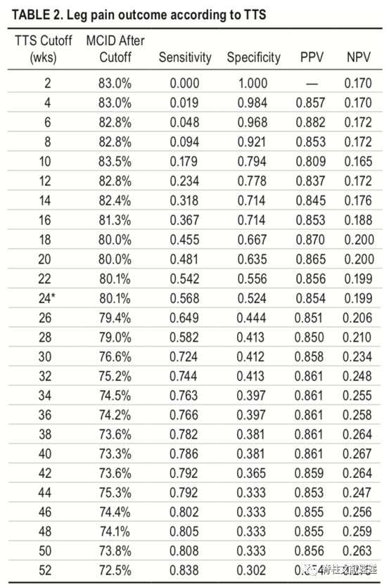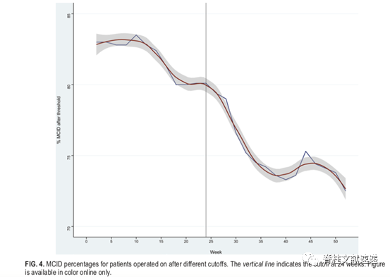 随着手术时机的推迟,临床差异越来越大,24周为最小临床意义差异。研究结果表明,延迟腰椎手术与患者术后腿部疼痛严重程度有关,认为无临床差异的手术时机为6个月。