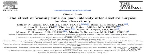 2.Quon J A ,Sobolev B G , Levy A R , et al. The effect of waiting time on pain intensityafter elective surgical lumbar discectomy[J]. The Spine Journal, 2013,13(12):1736-1748.
