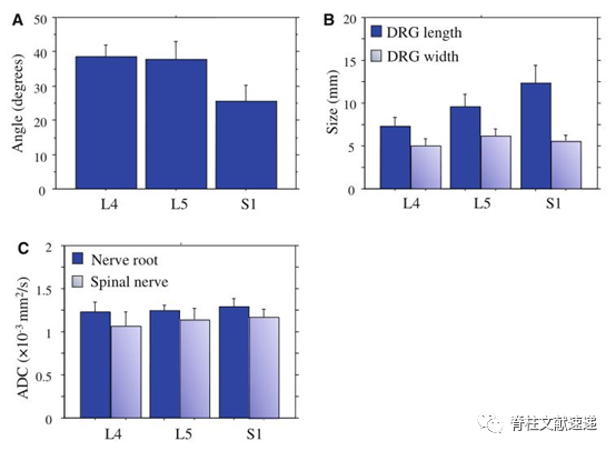 图注:背根神经节的角度(A),背根神经节的长度和宽度(B)的大小,以及健康志愿者近端/远端神经根平均ADC值 (C)。L4-L5背根神经节的角度40°,急剧下降到S1的25°。神经节的长度从L4增加到S1,宽度在L5处逐渐增加到最大值,在S1处逐渐减小。L4-S1神经根ADC值高于远端神经。