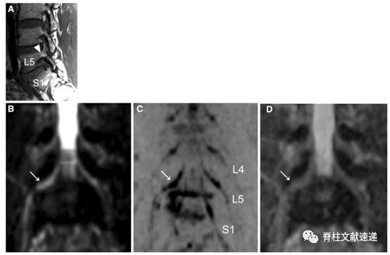 图注:66岁男性患者,L5-S1椎间孔狭窄,箭头显示L5椎间孔狭窄,神经周围脂肪信号消失。L4、L5和S1显示腰4、5和骶1神经根。D图是基于DWI冠状面计算的ADC图。箭头所示为被夹住的神经向上移位,并在孔内横移。